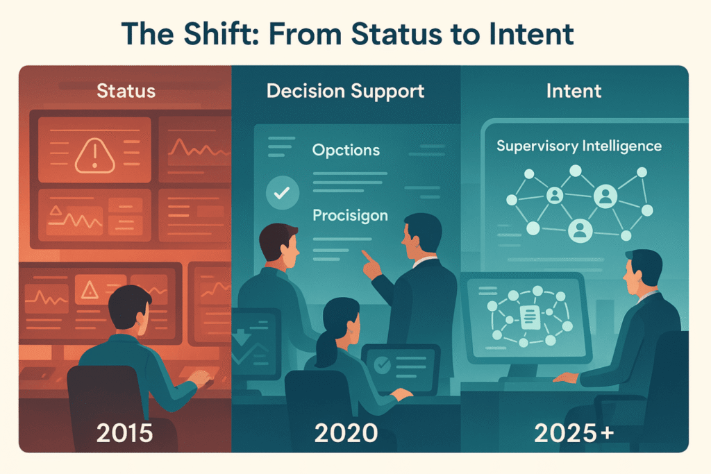 As this evolution continues, the way we manage operations will also change. We will see a growing need for supervisory viewsthat allow humans to oversee and guide teams of intelligent agents — agents that detect events, propose options, and act within authority limits.