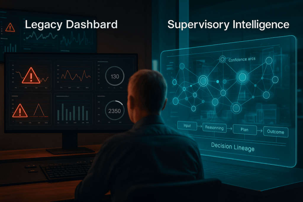 Traditional dashboards monitor physical assets. Supervisory Intelligence governs cognitive agents. The failure modes are completely different.