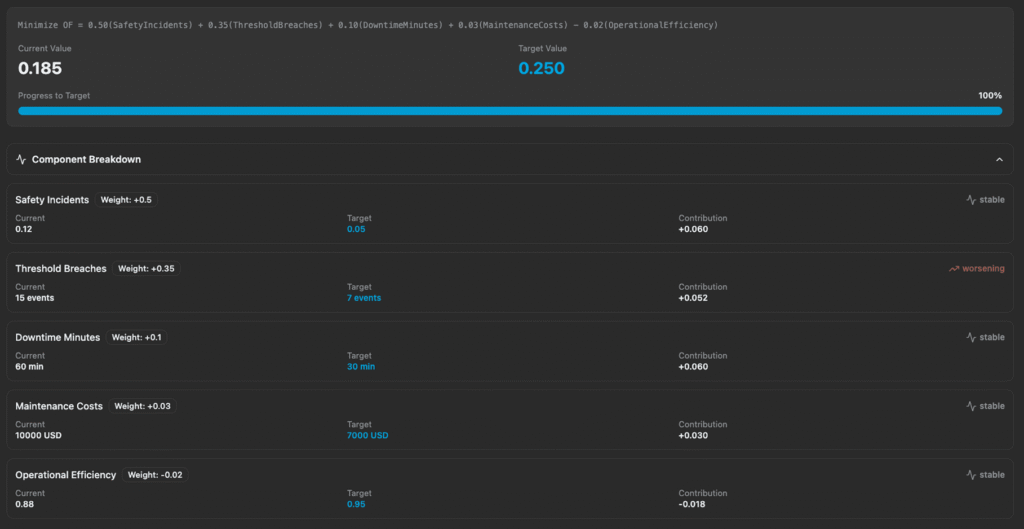 Parametric Control gives supervisors the ability to shape the intent of autonomous operations without micromanaging execution. Instead of adjusting hundreds of control parameters, supervisors tune Objective Function weights — the mathematical priorities that guide agent decision-making (for example: Safety 0.40, Quality 0.30, Cost 0.20, Throughput 0.10).