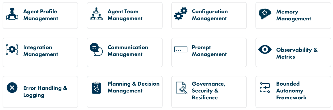 1. Agent Profile Management Define agents with complete profiles — including capabilities, authority envelopes, objective functions, and deontic authorization rules. Profiles are dynamically configurable and version-controlled for governed behavior.