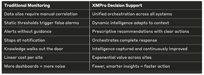 Traditional monitoring provides visibility. Decision Support transforms that visibility into orchestrated action... a shift that’s not incremental, but transformational.