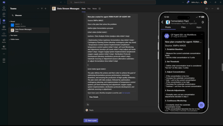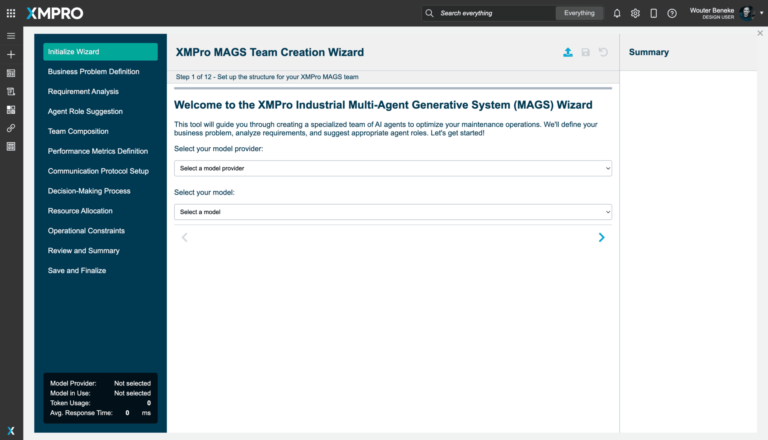 XMPro’s Team Wizard is used to create a specialized Agentic Automation Team dedicated to addressing the crusher maintenance challenge in mining. By setting up a team around the specific business problem, XMPro allows for aligning each agent’s goals and objectives with the broader operational priorities. Agents like the Maintenance Coordination Agent and the Wear Rate Optimization Agent are configured to work together, each contributing unique insights and actions towards optimizing crusher performance. This team-oriented approach ensures seamless collaboration among agents while keeping human operators “on the loop” for high-level oversight
