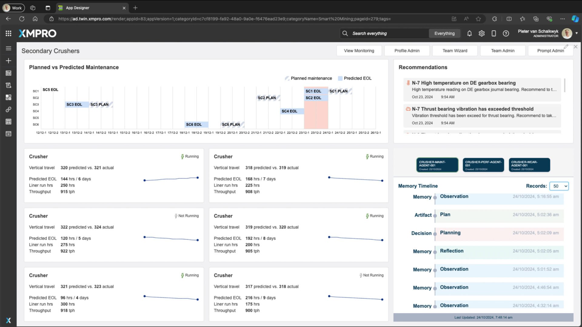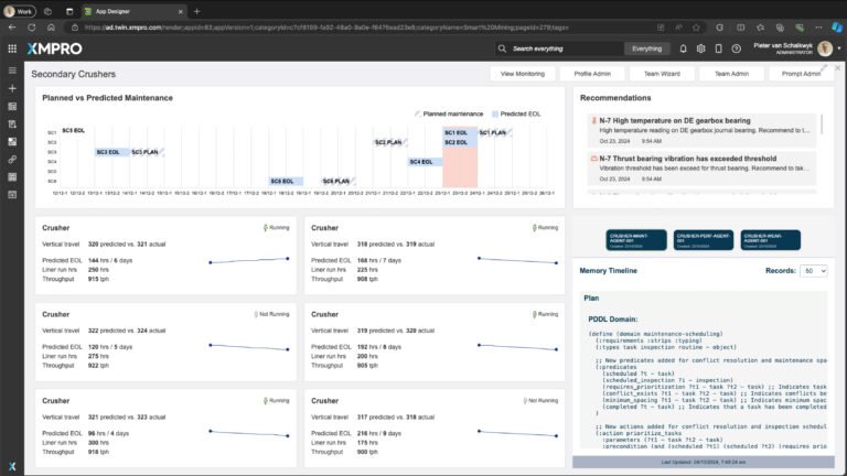 - Performance Monitoring Agent: This agent, built on XMPro’s data streaming and monitoring modules, ensures crushers meet throughput targets by continuously tracking deviations, unplanned downtimes, and operational stability. It provides alerts to human operators for significant variations, ensuring that crusher productivity remains consistent.