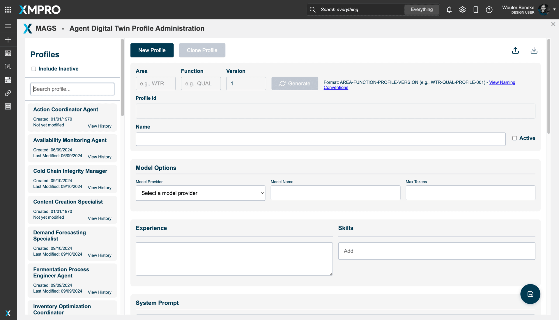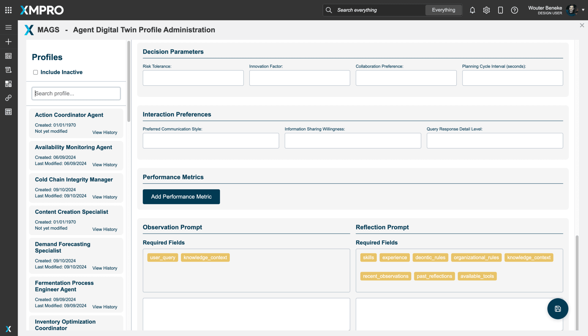 Next, XMPro iBOS enables users to configure a library of agent profiles specifically tailored to the tasks within crusher management. Each agent is equipped with distinct skills and capabilities, such as monitoring wear rates, scheduling maintenance, or analyzing throughput data. This configuration ensures that agents have the necessary skills to handle their assigned functions autonomously. The Skills library allows for fine-tuning the expertise of each agent to ensure they act intelligently and adaptively within their designated roles, laying a strong foundation for automation across different crusher maintenance tasks.