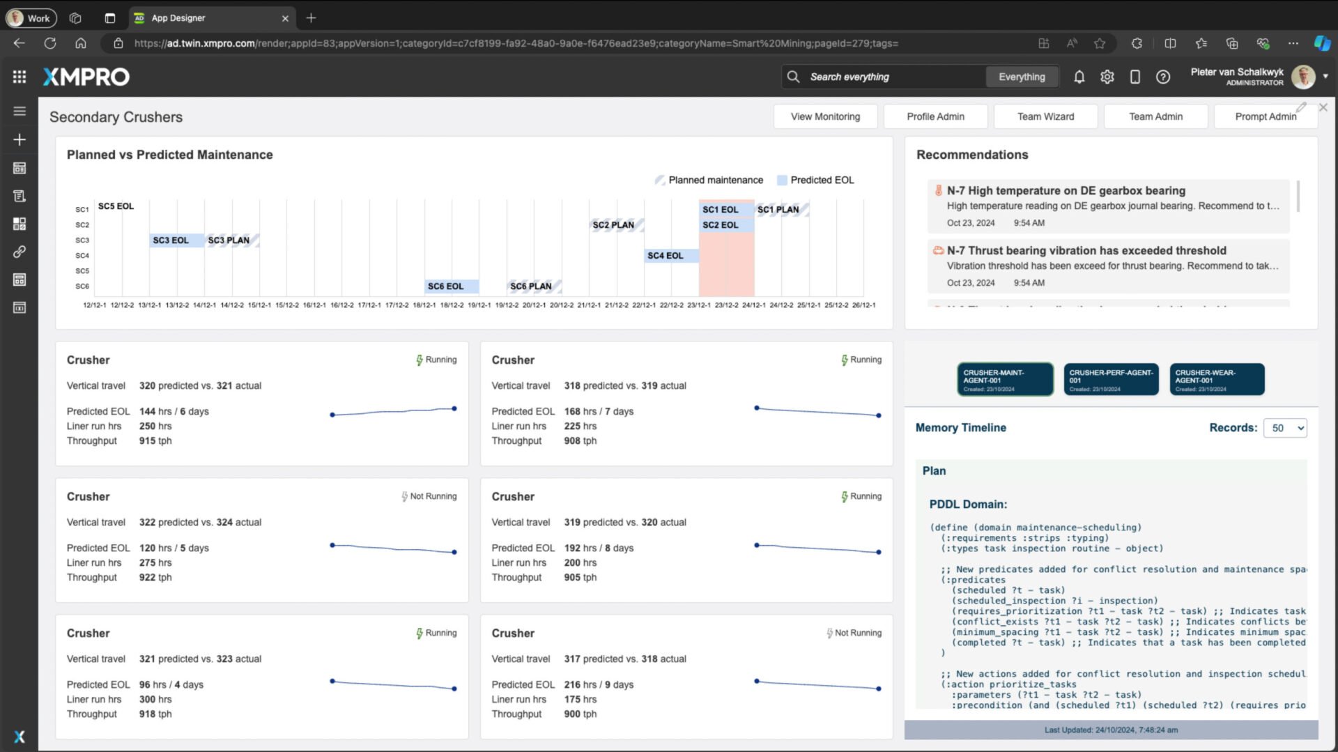 In the mining industry, crushers are essential to processing high volumes of material efficiently, yet their maintenance is both challenging and resource-intensive. Liner wear and equipment downtime are persistent issues, often resulting in unplanned maintenance, production delays, and increased operational costs. Scheduling maintenance for multiple crushers to minimize overlap and ensure availability is a complex task, as it requires balancing wear rates, resource constraints, and throughput demands. Human operators typically handle these decisions manually, monitoring equipment metrics, anticipating maintenance needs, and resolving conflicts in resource allocation. This reactive approach not only burdens maintenance teams but also limits operational flexibility and efficiency. High wear rates, resource conflicts, and the unpredictability of equipment failures create a continuous cycle of firefighting, impacting overall plant performance and increasing stress on human operators. The challenge is clear: how can mining operations achieve proactive, optimized crusher maintenance and performance management while reducing the manual workload on operators? Addressing this requires a system that can not only make routine maintenance decisions autonomously but also keep humans "on the loop" to allow for strategic oversight and critical interventions when necessary.The Solution: XMPro MAGS for Liner Analysis and Scheduling in Mining