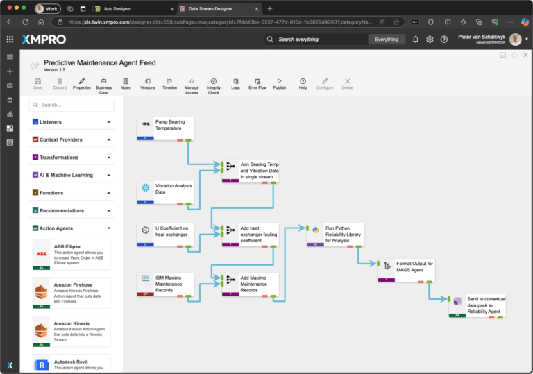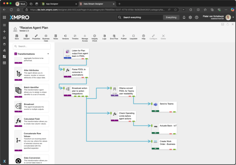 Once decisions are made, agents proceed to execute planned actions using XMPro’s data stream tools. This includes actions such as triggering maintenance work orders, sending alerts, or adjusting throughput targets to align with optimal performance goals. For example, if the Wear Rate Optimization Agent detects excessive wear, it can autonomously schedule a liner replacement to prevent downtime. The Actions step ensures that the entire cycle—from data intake to decision and execution—is closed, enabling XMPro’s MAGS to function autonomously while allowing operators to monitor and intervene if necessary.