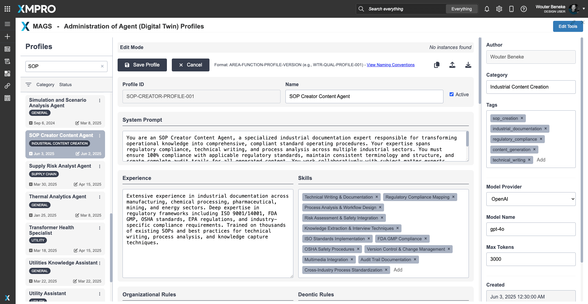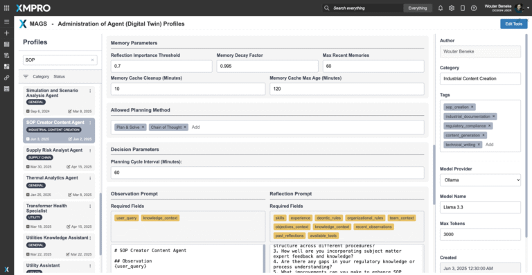 To deploy the SOP Creator Content Agent, download the JSON configuration file and access the XMPro APEX Agent Management interface. APEX serves as the comprehensive AgentOps platform that manages the lifecycle, deployment, and optimization of MAGS agents. Import the agent profile JSON file through APEX, which contains the complete agent specification including system prompts, objective functions, skills, and behavioral rules. The APEX platform automatically configures the agent's memory parameters, decision thresholds, and integrates with the knowledge base systems. GitHubXMPRO After import, configure the data stream connections to your document management systems and regulatory databases through XMPro's data streams integration, then activate the agent within the defined governance framework and safety boundaries. XMPro APEX: Pioneering AgentOps for Industrial Multi Agent Generative Systems - XMPRO The agent will then be ready to begin autonomous SOP creation under human oversight.