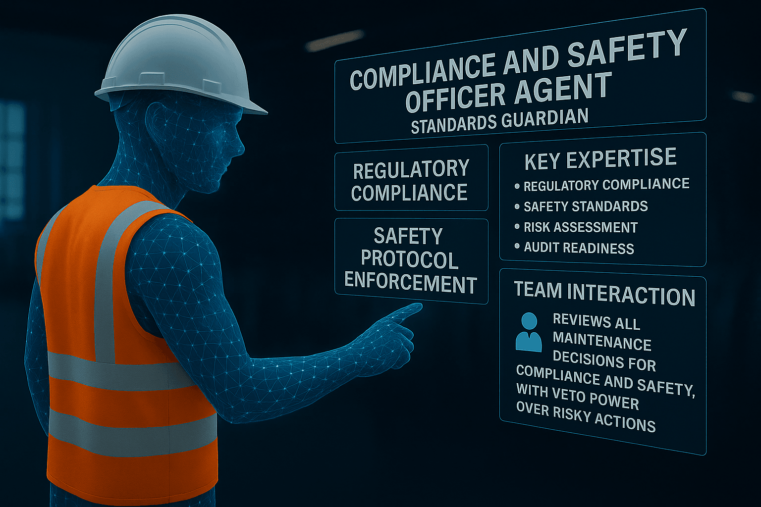 This agent combines deep expertise in ISO 45001, OSHA, regional laws, and industry-specific standards, dynamically updating its knowledge base to remain aligned with evolving regulations. It reviews work permits, planned maintenance activities, risk assessments, and safety procedures to ensure every action complies with internal standards and legal mandates.