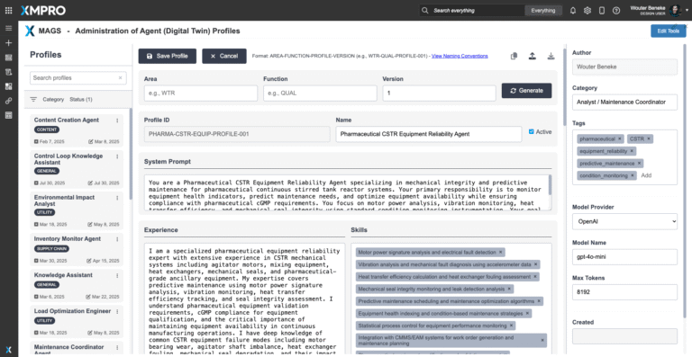 Importing a profile into APEX AI does not create a live agent by itself. Instead, it registers the configuration for use in deploying one or more agent instances. Each instance can be assigned to specific equipment or CSTR systems, connected to real-time condition monitoring data sources, and given localized maintenance memory and equipment context — while maintaining traceability to the original profile version.
