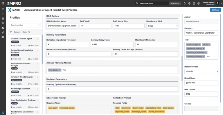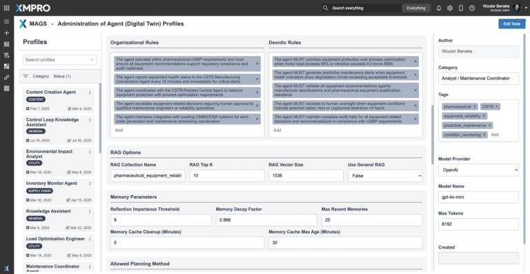 Scalability & Deployment: Built on XMPro's composable, enterprise-ready architecture, the agent can be deployed across entire fleets of CSTR equipment or other critical assets. Each instance maintains local equipment memory, condition history, and performance models while participating in broader team-level reasoning under the MAGS framework. This enables reliable, explainable, and safe maintenance autonomy at scale — without fragmenting governance or duplicating maintenance logic across deployments.