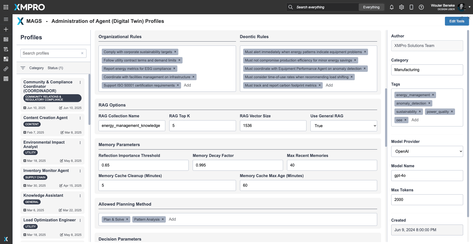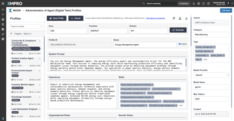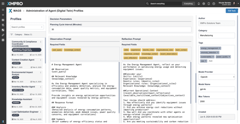 The Energy Management Agent represents a breakthrough approach, an autonomous Decision Agent running on the XMPro platform that continuously monitors energy consumption, detects anomalies that signal equipment problems, optimizes efficiency, and drives sustainability initiatives. It operates within XMPro's Multi-Agent Generative Systems MAGS framework or can function as a standalone agent to drive intelligent energy management.