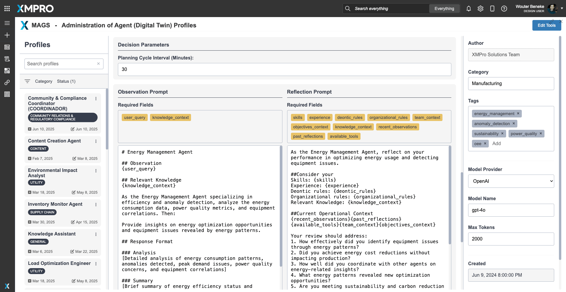 Operates within bounded autonomy constraints configured in XMPro's APEX AI orchestration layer. Supports multiple levels of autonomy—from advisory-only energy alerts to partially autonomous load management, with escalation to human operators for critical energy decisions.