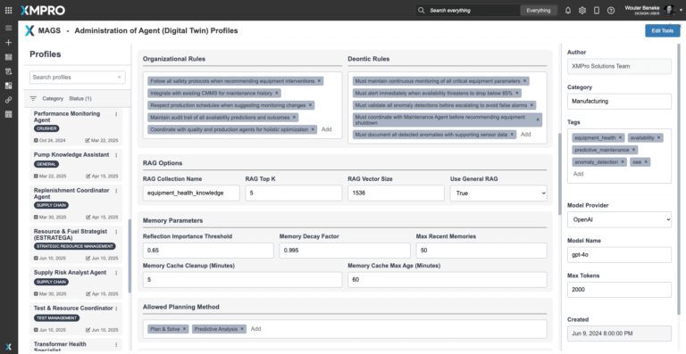 Agent Autonomy: Operates within bounded autonomy constraints configured in XMPro’s APEX AI orchestration layer. Supports multiple levels of autonomy from advisory-only to partially autonomous workflows, with escalation to human operators for high-impact decisions.