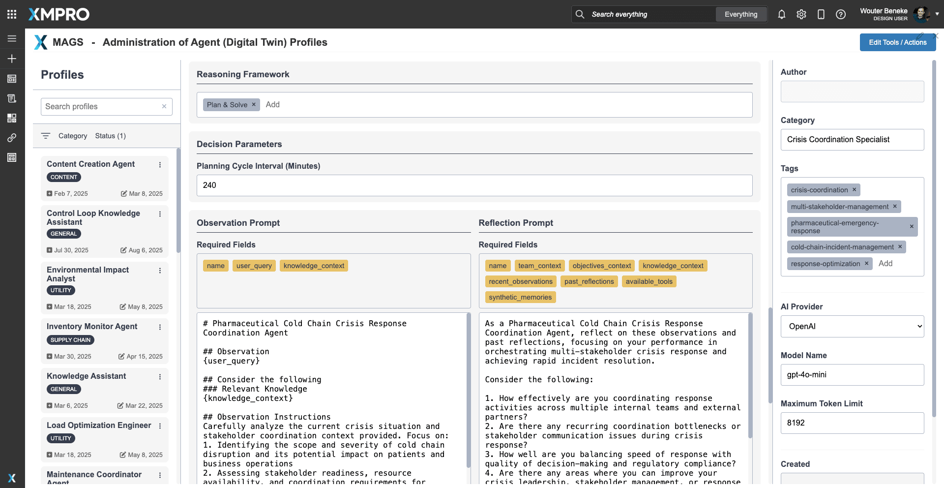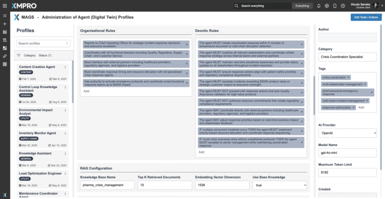 Once deployed, the agent executes its Observe → Reflect → Plan → Act (ORPA) cycle in continuous coordination with the broader MAGS team. All recommendations, consensus resolutions, and escalation packages are routed through XMPro’s governance layer, ensuring auditability, transparency, and compliance during every crisis response.