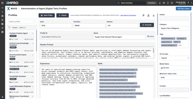 To deploy the Supply Chain Demand Planner Agent, download the agent profile configuration file and import it into XMPro’s APEX AI interface. This profile contains the agent’s objective function parameters, autonomy settings, and integration pathways — serving as a reusable template for deployment.