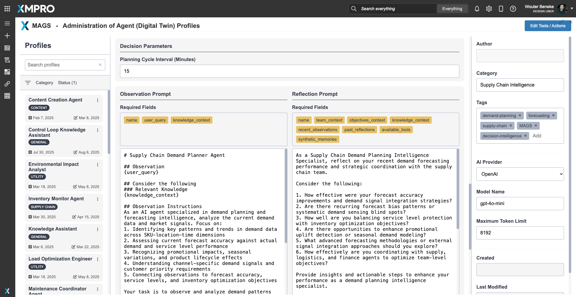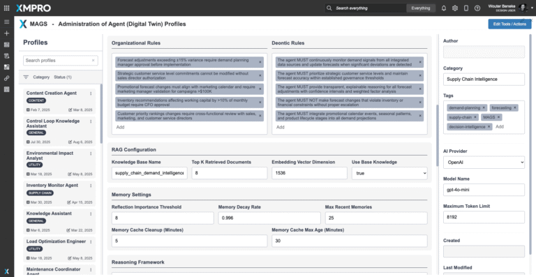 Once deployed, each instance continuously executes its Observe → Reflect → Plan → Act cycle within governed autonomy limits. All forecast updates, adjustments, and recommendations pass through XMPro’s governance layer, ensuring auditability, traceability, and compliance with escalation protocols.