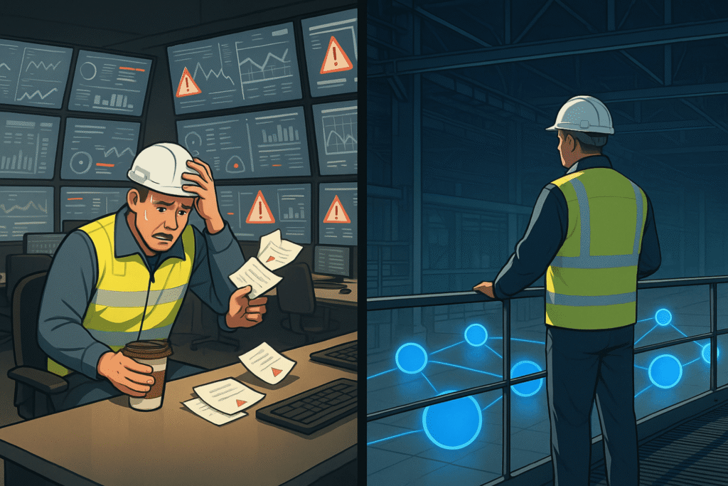 Industrial operations now generate over 1,000 alarms per operator per day compared to 60 to 100 historically. Up to 99 percent require no intervention. Adding more Business Intelligence dashboards to cope with this volume creates dashboard sprawl. Operators move between SCADA screens, historian tools, ERP views, MES consoles and IoT dashboards. All are visible, but none create coordinated operational response.